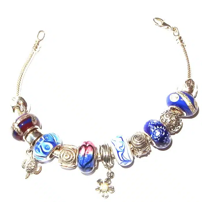 The internal of the marbled Murano glass bead is made from sterling silver and features a 92.5 stamp. This means it is 92.5% fine silver with no more than 7.5% of copper or other metals. This formula is internationally accepted and it gives sterling silver the hardness and the tolerance to work with. Anything higher than 92.5 would be too soft and tarnish too quickly. When you buy sterling silver from us, we can guarantee it is just that!