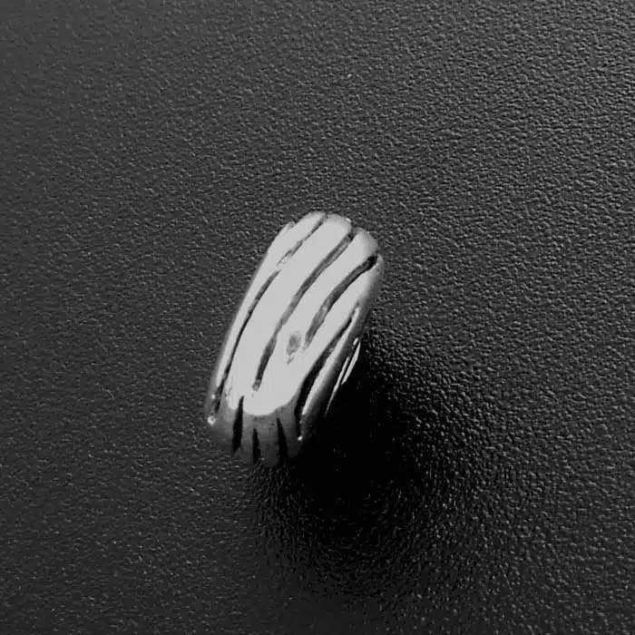 Stripy Pandora Compatible Bead is sterling silver. Being compatible means it has internal threading the same as Pandora and Camilla style bracelets. This is also a great spacer to put in between feature beads on your bracelet.