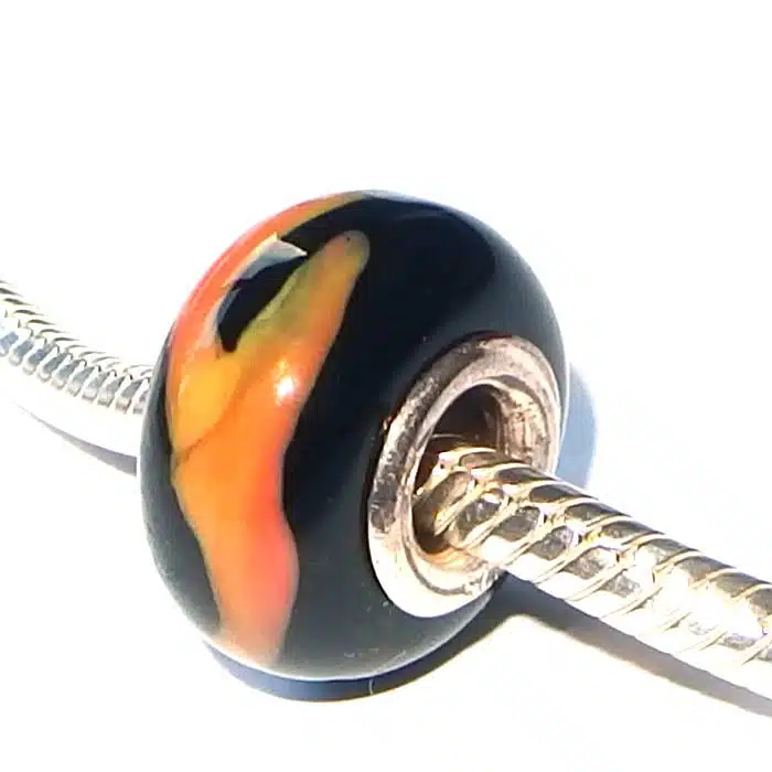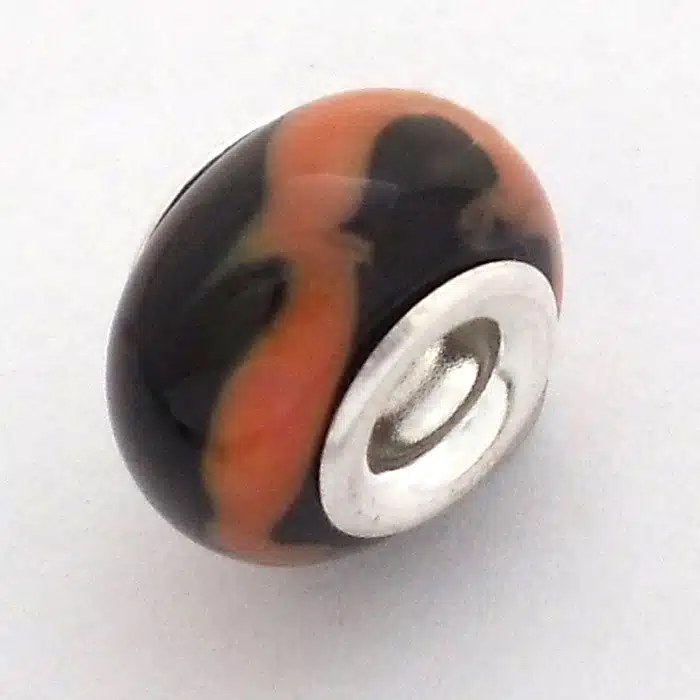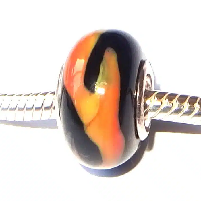 Tiger stripe Murano glass bead with sterling silver 92.5 internal. This Murano glass bead is Pandora compatible, meaning it will fit onto your Pandora and Camilla styled bracelets. They are a great way to add some colour into your bracelets.