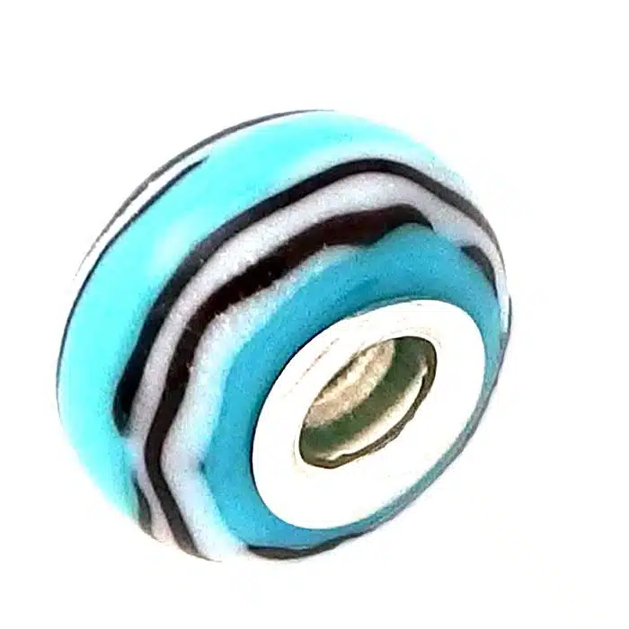 Turquoise Blue Glass Bead with sterling silver 92.5 internal section. This Murano glass bead is Pandora compatible, meaning it will fit onto your Pandora and Camilla styled bracelets. The Murano glass bracelet beads are a great way to add some colour into your bracelets.