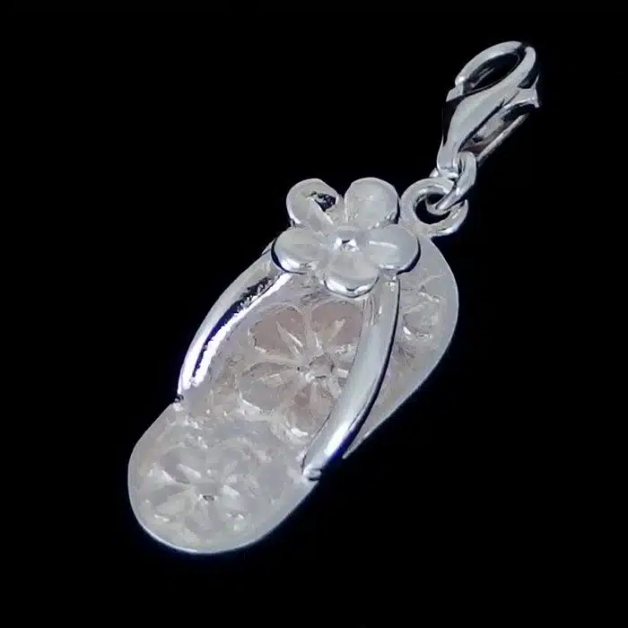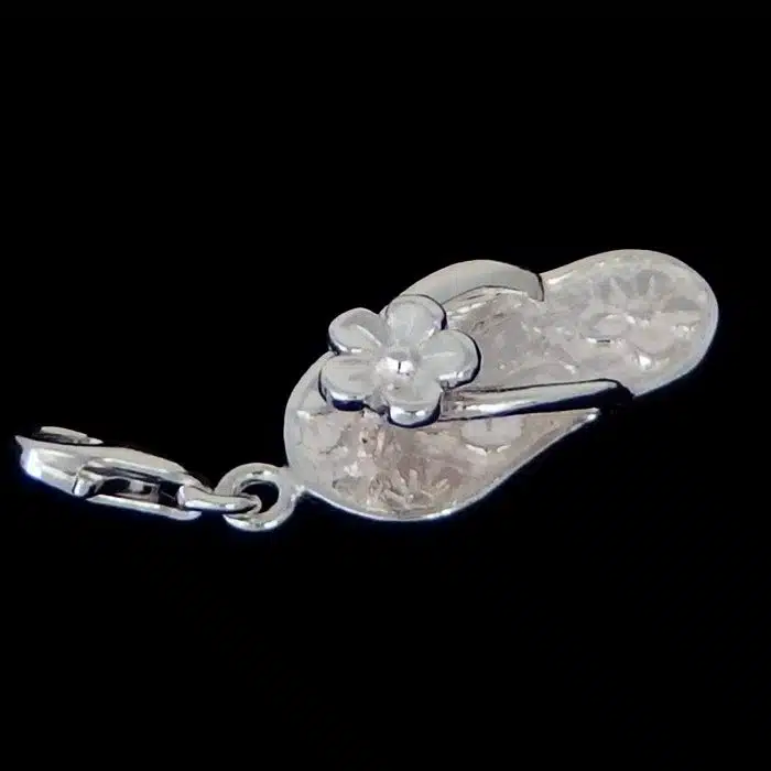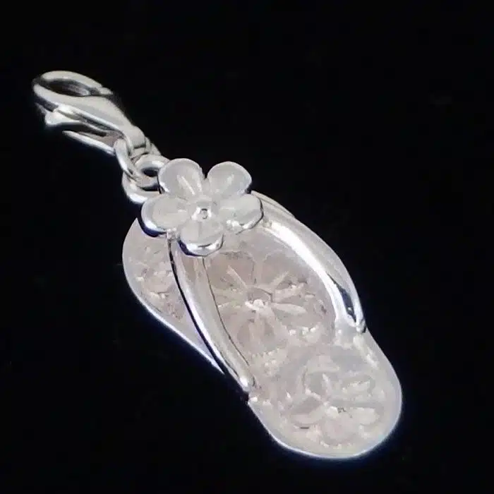 Flower jandal charm clip is sterling silver 92.5. This is real silver, not just plated. It has gorgeous flower stamped onto the sole of the jandal. It also features a flower raised between the toes. This bracelet charm is a great kiwi icon. This jandal charm clip is easy to clip on and ideal for a charm bracelet. It is a more heavy and solid charm compared to the cut out one we used to have.