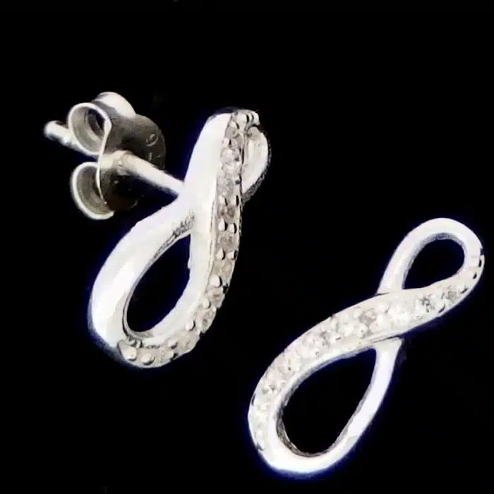 The Cubic Zirconia Infinity studs are made from sterling silver and features a 92.5 stamp. This means it is 92.5% fine silver with no more than 7.5% of copper or other metals. This formula is internationally accepted and it gives sterling silver the hardness and the tolerance to work with. Anything higher than 92.5 would be too soft and tarnish too quickly. When you buy sterling silver from us, we can guarantee it is just that!