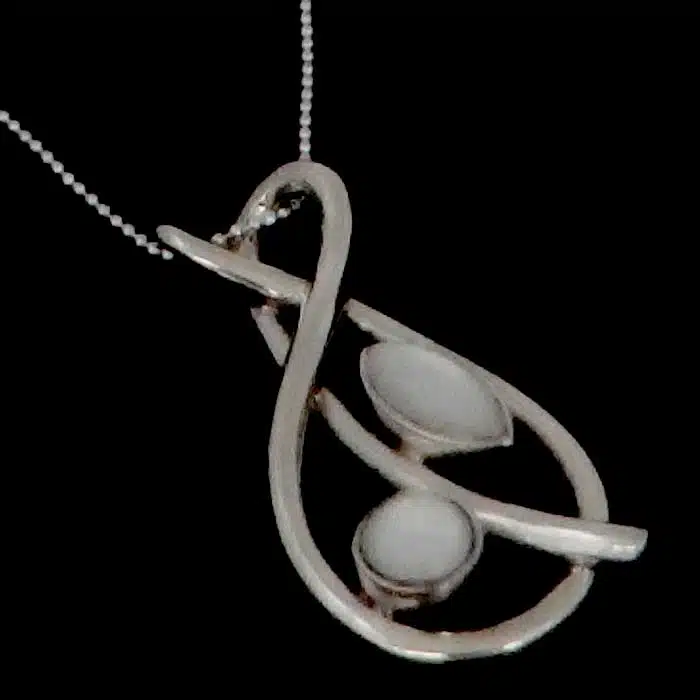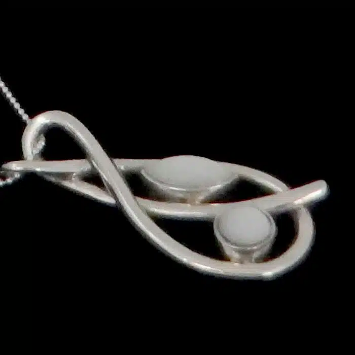 Curvy Mother Pearl Necklace is sterling silver 92.5. This is real mother of pearl shell and reflects the light. Chain weaves in and out of two separated curves to hang pendant.