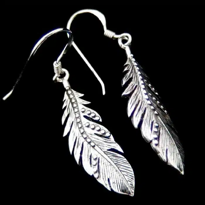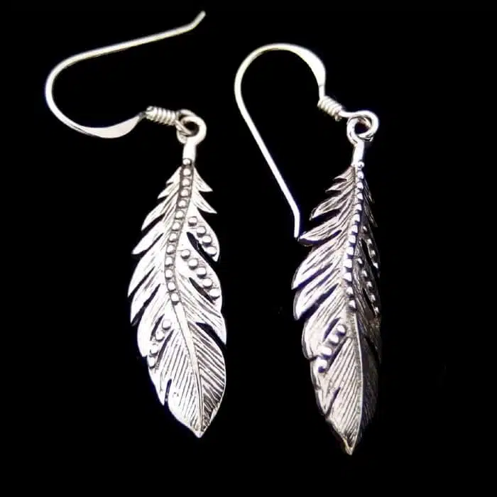 Curved feather earrings NZ are beautifully detailed with raised dots adding dimension and texture. The shape is graceful and gently curved. Stylish and easy to wear. These sterling silver feather NZ earrings are very popular. Of Aztec origins these feather earrings will look great.