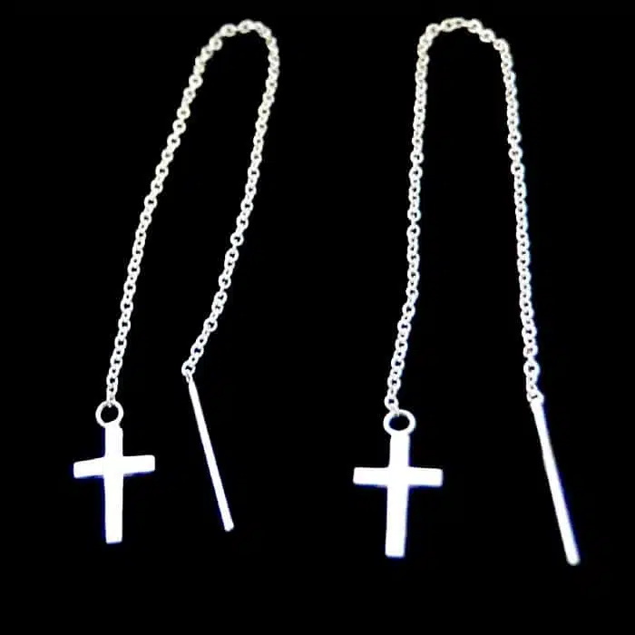 Cross Thread Earrings Sterling Silver feature a highly polished cross at the end of the chain. Simply gorgeous. The chain and stick simply thread through the earring hole making both pieces dangle sweetly. Perfect as a gift and for a subtle Christian sign or a fashion statement.