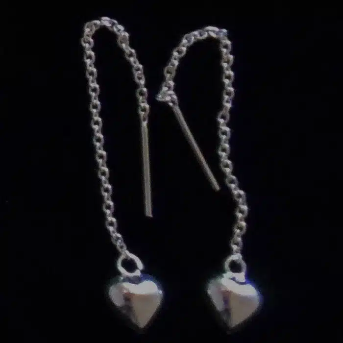 Heart threader earrings are so cute and in sterling silver 92.5. Just thread the small stick attached to a chain through your ear and let the chain dangle. The thread concept began in the early 90s and you do not require a butterfly to keep the thread earrings in the ear as the dangle is enough to hold them in place.
