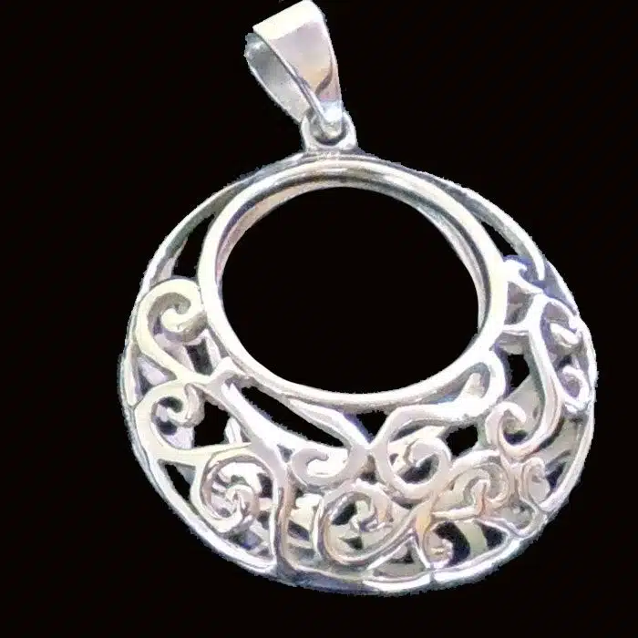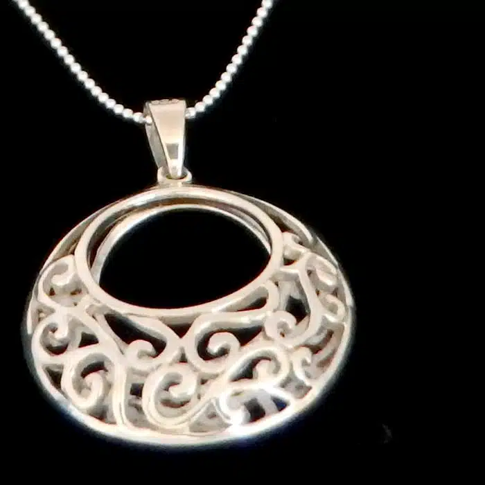 Filigree 3D necklace silver has gorgeous detailing. It is a large sterling silver necklace and will certainly stand out and make a statement. We love the cut out circles. This three dimensional pendant has a matching underside. This Filigree pendant necklace is perfect on a chain or a choker.