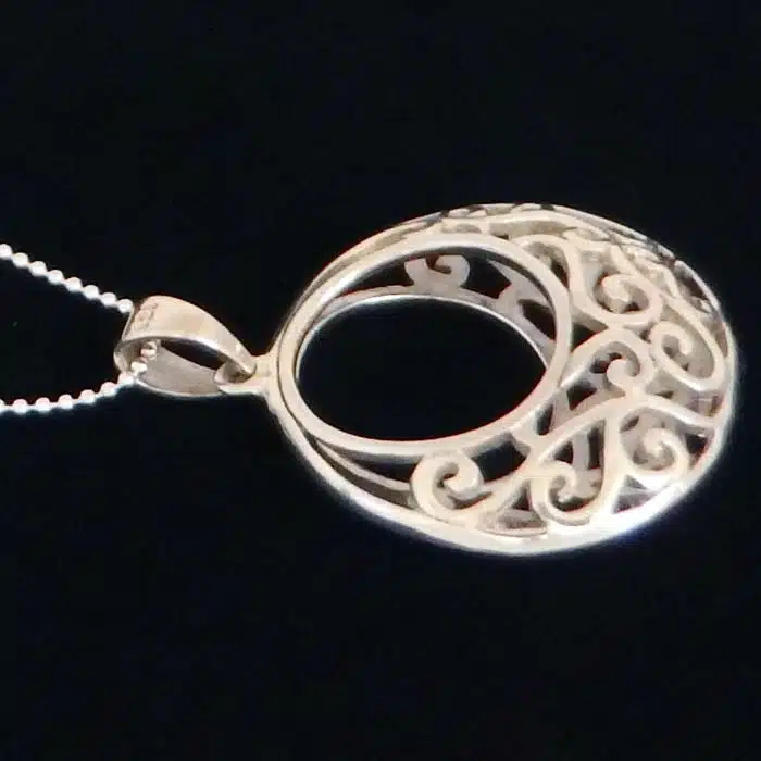 This Filigree 3D necklace silver is made from sterling silver and features a 92.5 stamp. This means it is 92.5% fine silver with no more than 7.5% of copper or other metals. This formula is internationally accepted and it gives sterling silver the hardness and the tolerance to work with. Anything higher than 92.5 would be too soft and tarnish too quickly. When you buy sterling silver from us, we can guarantee it is just that!