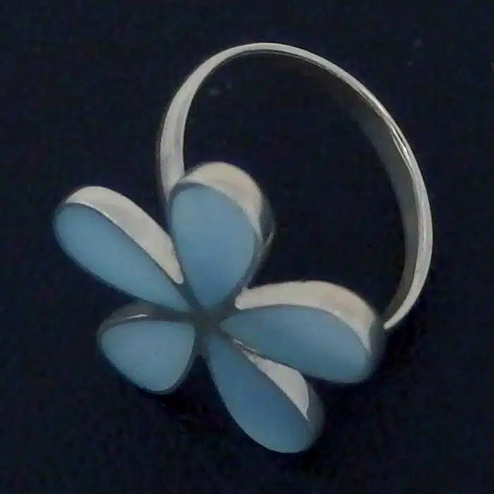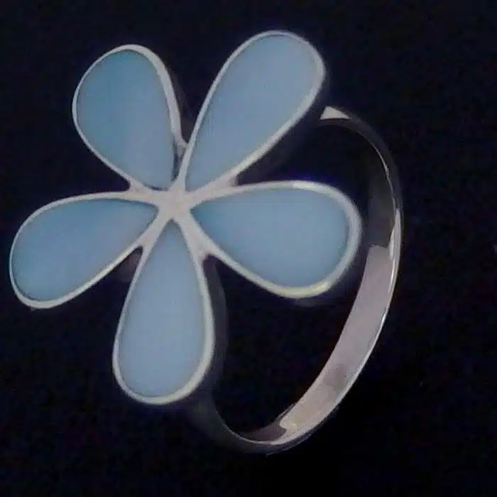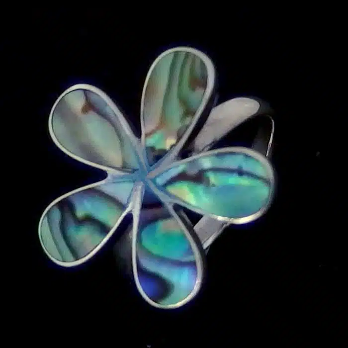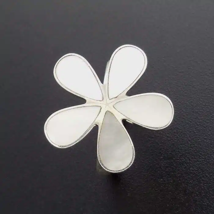 This five petal flower shell ring is made from sterling silver and features a 92.5 stamp. This means it is 92.5% fine silver with no more than 7.5% of copper or other metals. This formula is internationally accepted and it gives sterling silver the hardness and the tolerance to work with. Anything higher than 92.5 would be too soft and tarnish too quickly. When you buy sterling silver from us, we can guarantee it is just that!
