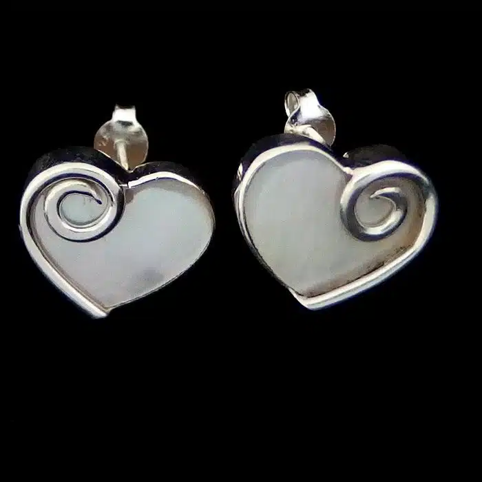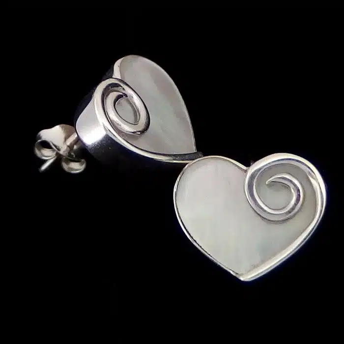 Heart Pearl Studs are made of real sterling silver 92.5. The white mother of pearl is also real natural shell. The white mother of pearl is encased in sterling silver with a “Koru” spiral wrapped around one edge. These are quite a large pair of studs and cover much of the ear lobe. This makes them super classy and a little more expensive. There is more silver in this item than usual smaller studs.