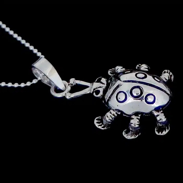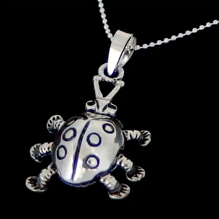 The crawling ladybird pendant is made from sterling silver and features a 92.5 stamp, this means it is 92.5% fine silver with no more than 7.5% of copper or other metals. This formula is internationally accepted and it gives sterling silver the hardness and the tolerance to work with. Anything higher than 92.5 would be too soft and tarnish too quickly. When you buy sterling silver from us we can guarantee it is just that!
