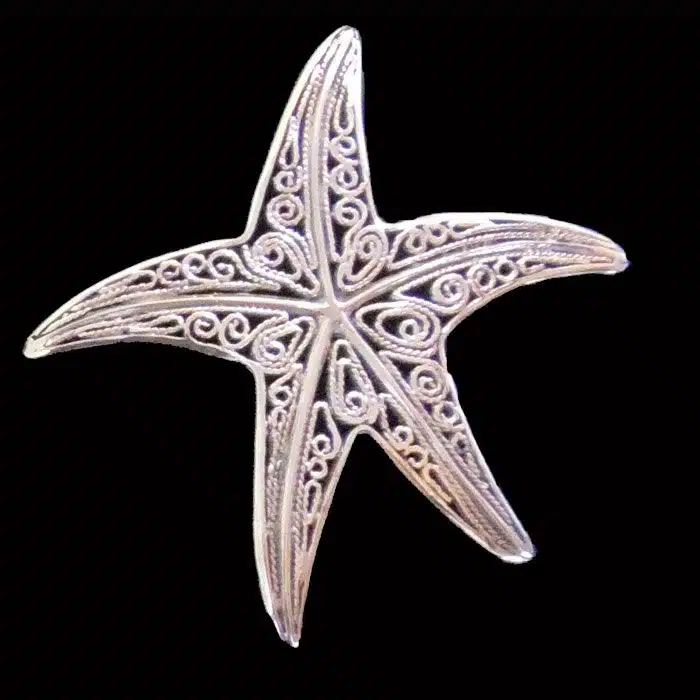 The giant starfish pendant is made from sterling silver and features a 92.5 stamp, this means it is 92.5% fine silver with no more than 7.5% of copper or other metals. This formula is internationally accepted and it gives sterling silver the hardness and the tolerance to work with. Anything higher than 92.5 would be too soft and tarnish too quickly. When you buy sterling silver from us we can guarantee it is just that!