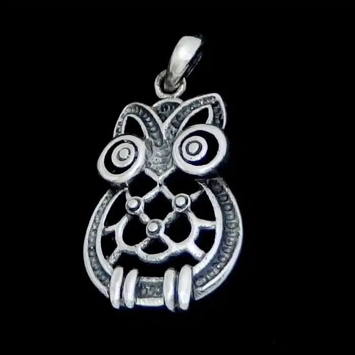 The silver cut out owl pendant. Today’s modern owl pendant, this owl has huge spiral eyes, and a web like centre body.
