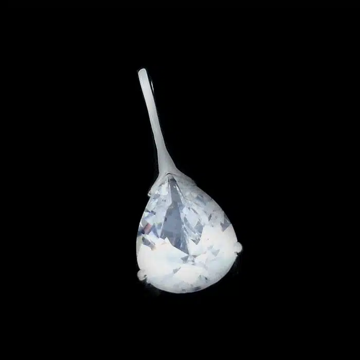 Faceted CZ teardrop pendant made from sterling silver 92.5. Long tear drop pendant, when reversed is open and pointed so that the light can shine through. This Cubic zirconia necklace is classy and looks great on the neckline on a short chain. It also looks awesome on a long chain over the clothes.