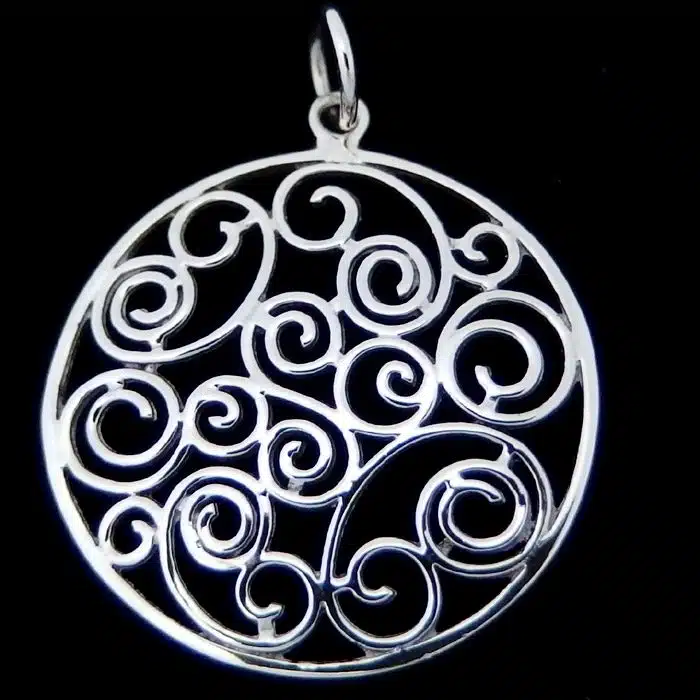 The Filigree Spirals Pendant necklace is made from sterling silver and features a 92.5 stamp. This means it is 92.5% fine silver with no more than 7.5% of copper or other metals. This formula is internationally accepted and it gives sterling silver the hardness and the tolerance to work with. Anything higher than 92.5 would be too soft and tarnish too quickly. When you buy sterling silver from us, we can guarantee it is just that! If you see the words silver plated, that means it only has a coating of sterling silver over another alloy. This will fade over time and is not able to be polished. Our sterling silver products are not plated but sterling silver all the way through– nothing but the good stuff for you!!