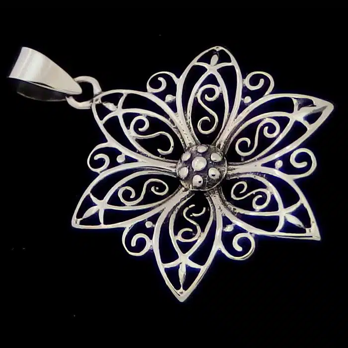 The Filigree Flower Burst Pendant is made from sterling silver and features a 92.5 stamp, this means it is 92.5% fine silver with no more than 7.5% of copper or other metals. This formula is internationally accepted and it gives sterling silver the hardness and the tolerance to work with. Anything higher than 92.5 would be too soft and tarnish too quickly. When you buy sterling silver from us we can guarantee it is just that!