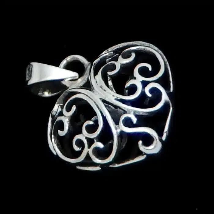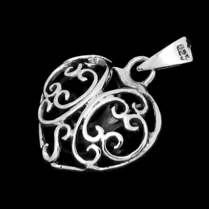 The filigree puff heart pendant is made from sterling silver and features a 92.5 stamp, this means it is 92.5% fine silver with no more than 7.5% of copper or other metals. This formula is internationally accepted and it gives sterling silver the hardness and the tolerance to work with. Anything higher than 92.5 would be too soft and tarnish too quickly. When you buy sterling silver from us we can guarantee it is just that!