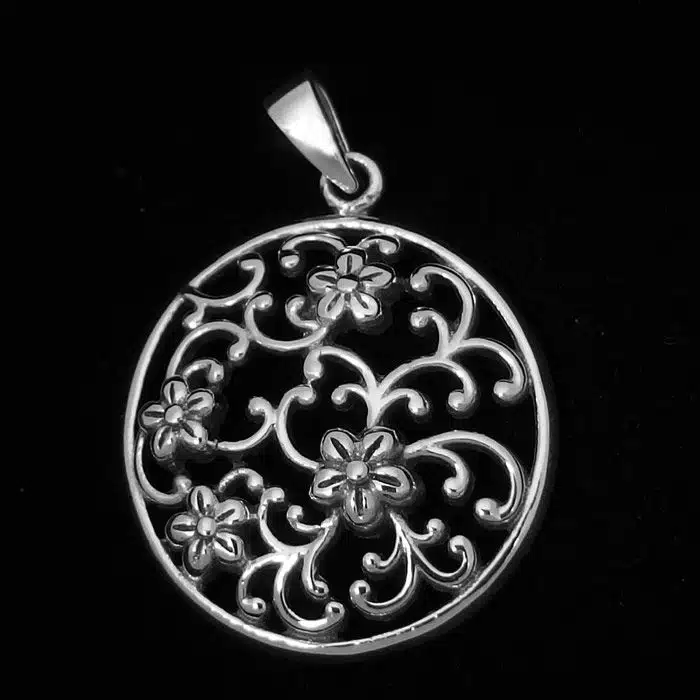 The filigree vintage flower pendant is made from sterling silver and features a 92.5 stamp, this means it is 92.5% fine silver with no more than 7.5% of copper or other metals. This formula is internationally accepted and it gives sterling silver the hardness and the tolerance to work with. Anything higher than 92.5 would be too soft and tarnish too quickly. When you buy sterling silver from us we can guarantee it is just that!