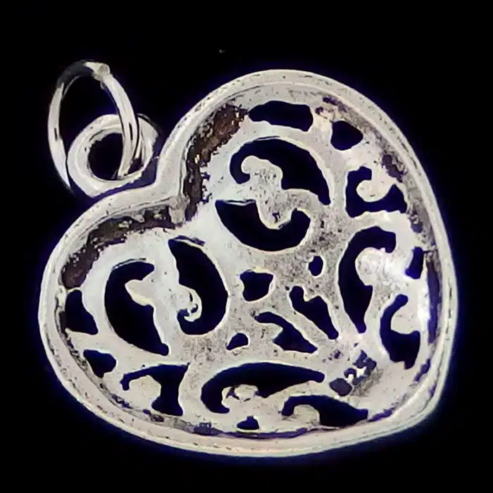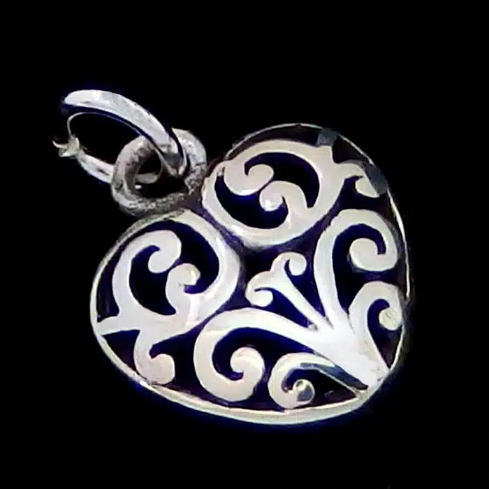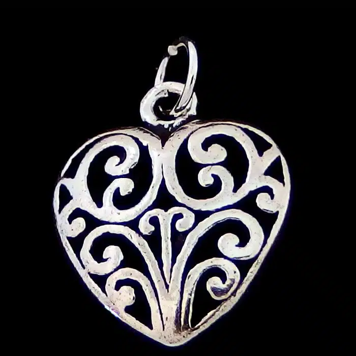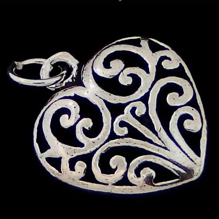 Silver Koru Heart Pendant is sterling silver 92.5. It has such amazing detailing of cut out silver. It is a great price as it is not too heavy as it is only one sided. Silver Spiral heart necklace is so sweet and sure to please.