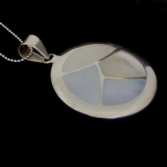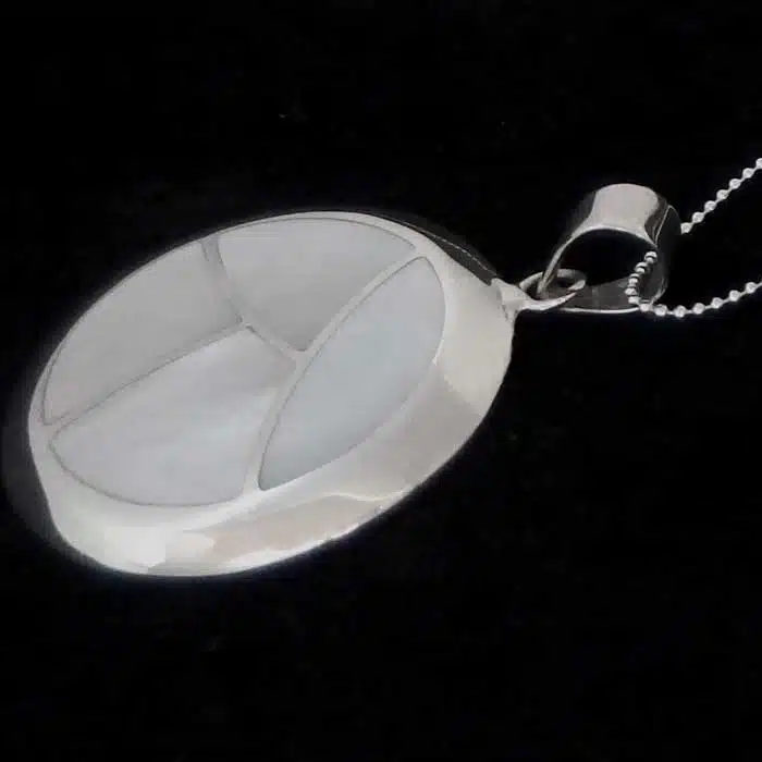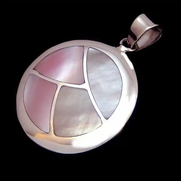 Mosaic Shell pendant necklace NZ features mother of pearl shell in various combinations. This pendant is a little like a mosaic, with cut out pieces joining to make a circle. The pendant mount of the mosaic circle shell pendant is securely soldered to the pendant. It also has a large pendant mount so will take a thicker chain Just add a chain from our chain section.