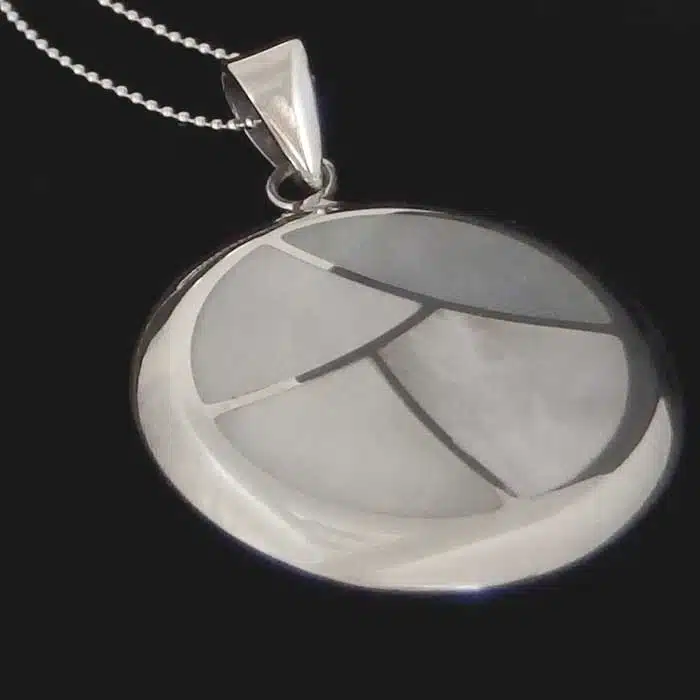 Both the mosaic circle shell pendant and pendant mount are made from sterling silver and features a 92.5 stamp, this means it is 92.5% fine silver with no more than 7.5% of copper or other metals. This formula is internationally accepted and it gives sterling silver the hardness and the tolerance to work with. Anything higher than 92.5 would be too soft and tarnish too quickly. When you buy sterling silver from us we can guarantee it is just that!