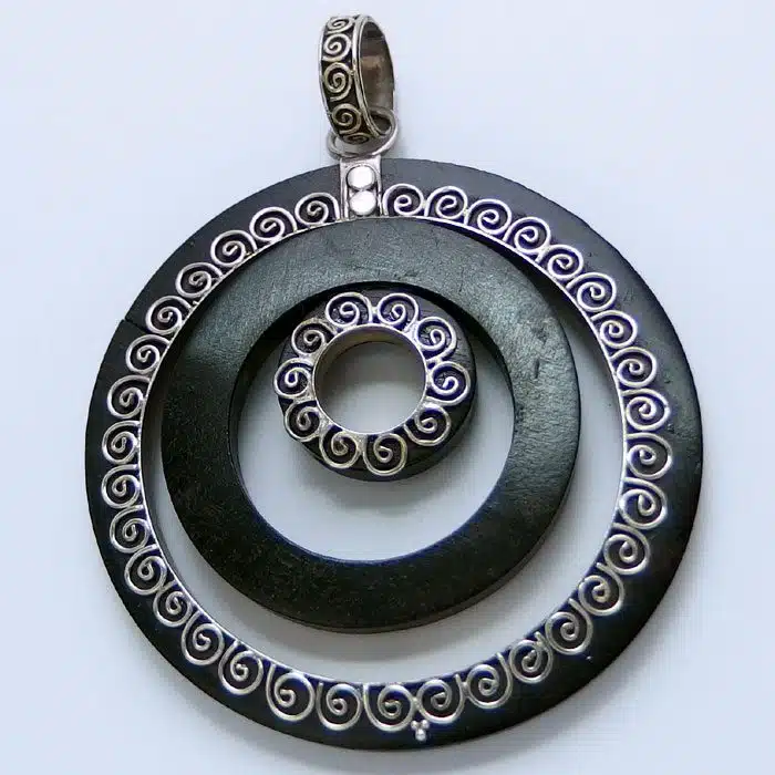 Multi circle wood pendant features three wood circles with delicate silver work laid on the top. It has a large pendant mount for thicker chains.