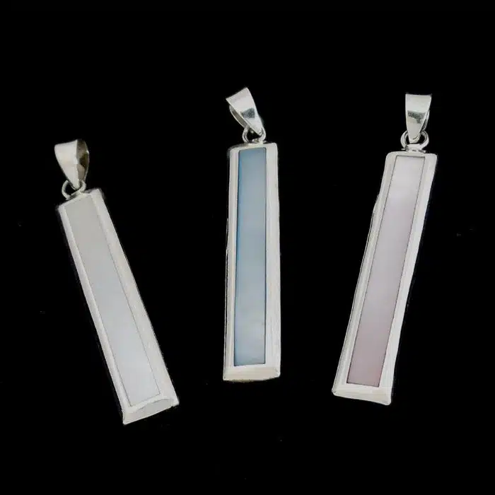 Slim rectangle shell pendant necklace is sterling silver 92.5. It comes in many different colours. It features a rectangle shell with a generous border. The shell is real mother of pearl (dyed or natural) or paua or black. It has a larger 3mm width pendant mount for thicker chains.