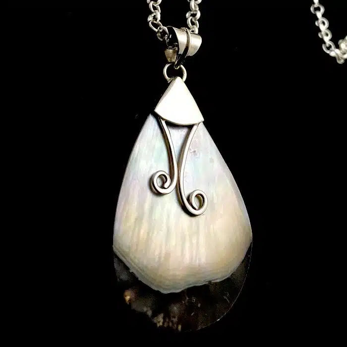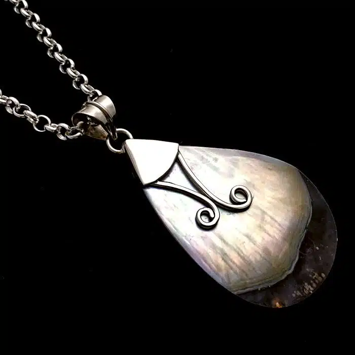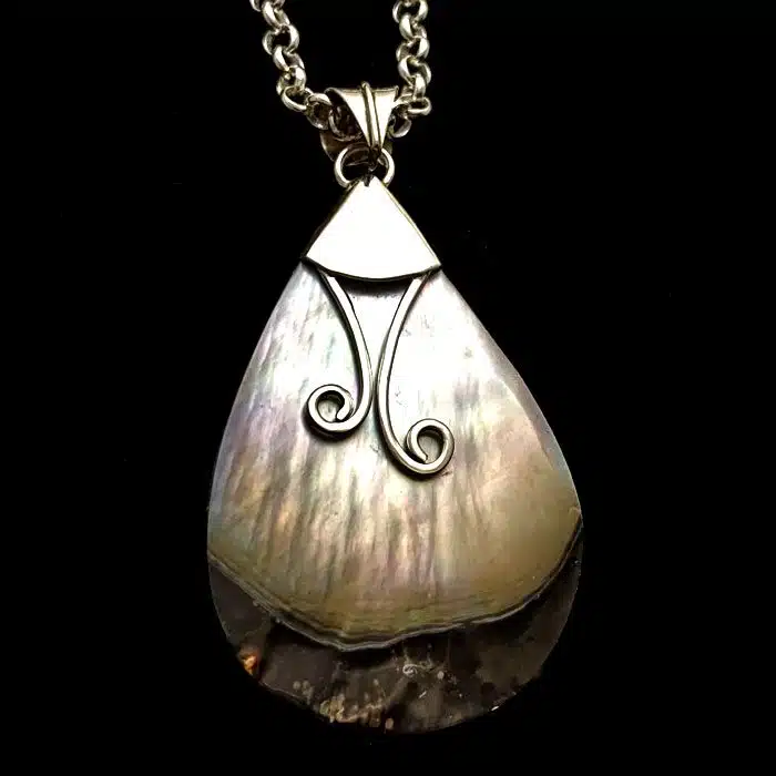 The two tone koru shell pendant is made from sterling silver and features a 92.5 stamp, this means it is 92.5% fine silver with no more than 7.5% of copper or other metals. This formula is internationally accepted and it gives sterling silver the hardness and the tolerance to work with. Anything higher than 92.5 would be too soft and tarnish too quickly. When you buy sterling silver from us we can guarantee it is just that!