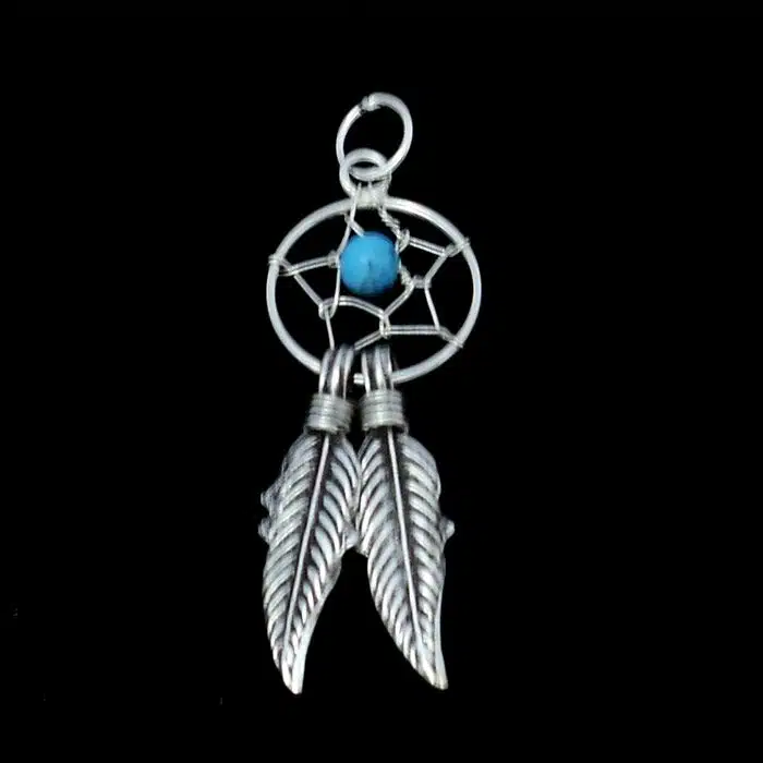 This intricately made dream catcher pendant necklace is made from sterling silver and features a 92.5 stamp. The woven detailing of the cobweb silver wire with a turquoise bead and two feathers give this pendant an Aztec look and feel. The dream catcher pendant is sterling silver which means it is 92.5% fine silver with no more than 7.5% of copper or other metals. This formula is internationally accepted and it gives sterling silver the hardness and the tolerance to work with. Anything higher than 92.5 would be too soft and tarnish too quickly. When you buy sterling silver from us, we can guarantee it is just that!