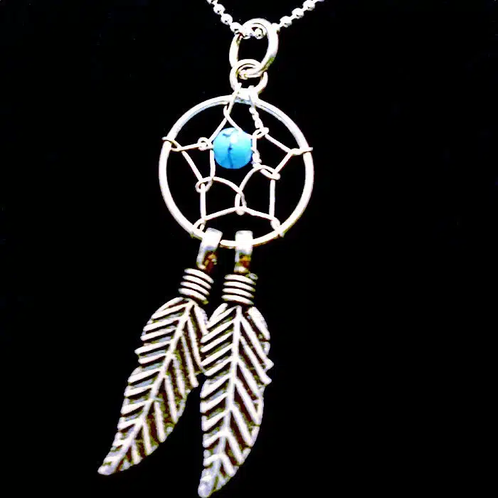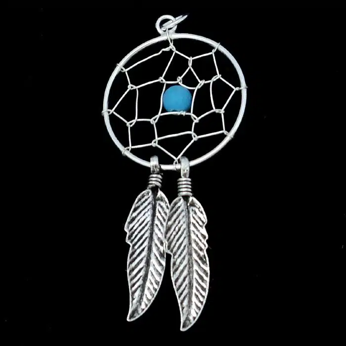 Dream catcher pendant necklace features a circular framed sterling silver net. Inside the centre of the entwined net is a turquoise bead. At the bottom of the circle are two dangling feathers. The dream catcher is used by American Indian people to help block bad dreams and catch good ones. Two sizes available!