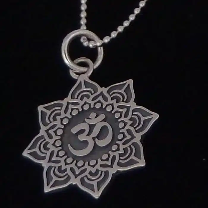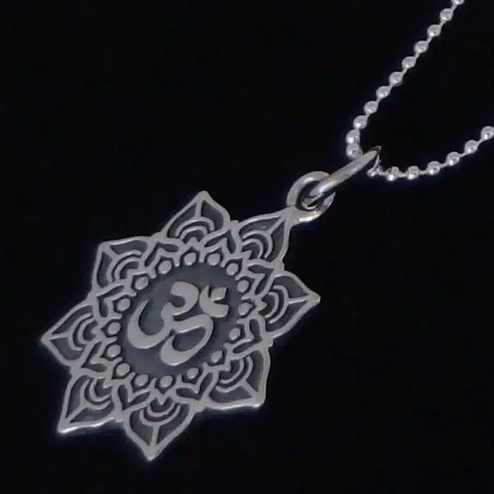 Om Necklace Sterling Silver is solid and real silver. We love the centre Om and the Mandala surround. It is highly polished plain silver on the back which gives it a quality finish. This Om Necklace Sterling Silver can be purchased with or without a chain. You can of course choose a different chain to the one photographed but we love the chain displayed has faceted balls making it sparkle a little more than a normal chain.