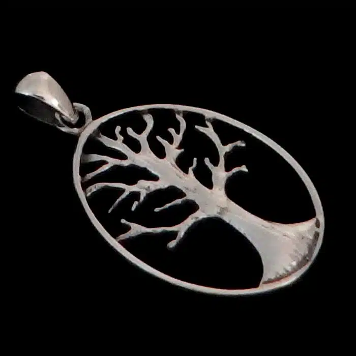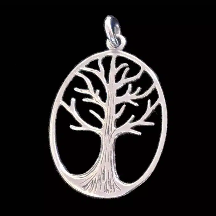 Oval tree of life pendant necklace features an oval cut out family tree pendant with beautiful sterling silver trunk and branches. This pendant looks stunning on a sterling silver chain or black leather.