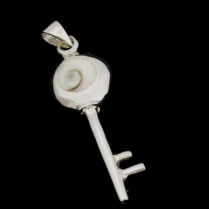 Silver Shiva key pendant is sterling silver 92.5. This shell key necklace just needs a chain added. It features a classic key shape with a round Shiva shell at its base.