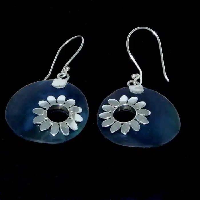 Rainbow Shell Flower Earrings are made of real sterling silver 92.5. They feature a round disc of rainbow shell, with a sterling silver flower on top of a cut out hole. These earrings are hand made and a one off unique piece. We love the size of this pair of earrings. The rainbow shell is darker in colour than paua shell but shines a green blue in thee different lights. It contrasts nicely with the silver. These rainbow shell earrings have awesome workmanship. They are a medium size and dangle from a hand made hook.