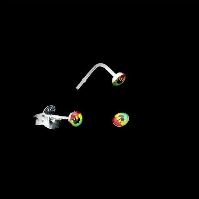 Rasta stud is made of sterling silver 92.5. This stud earring features a small circle with Rasta colours and a black herb leaf. The picture is glued in and lays flat on the nose or ears. With the smaller 3mm diameter studs you can bend it slightly or keep it straight and use as a nose stud. The bigger 5mm Rasta stud earrings are best in the ears.