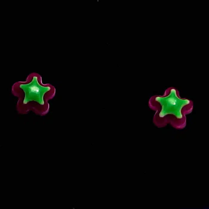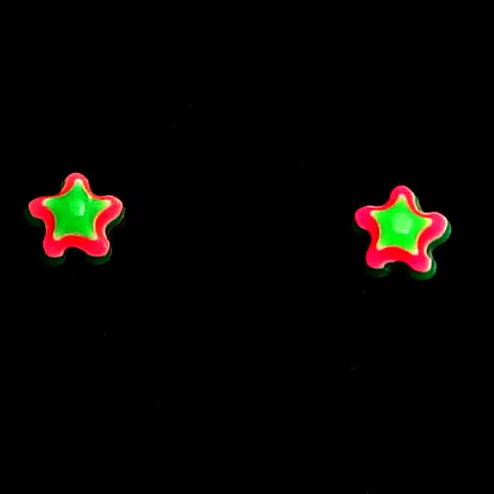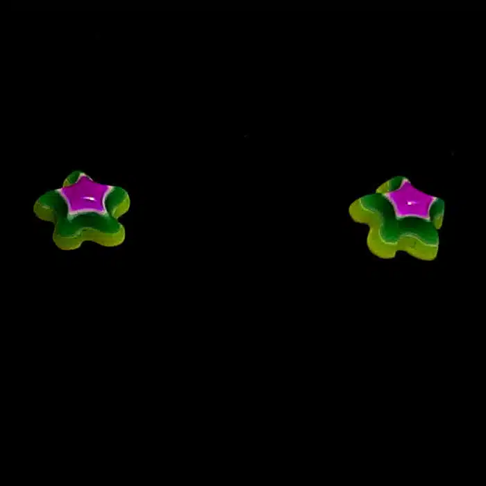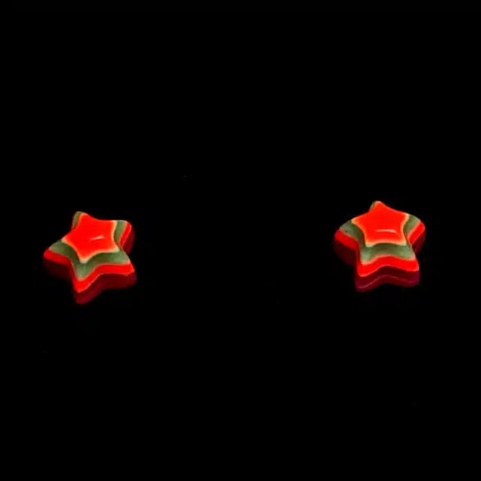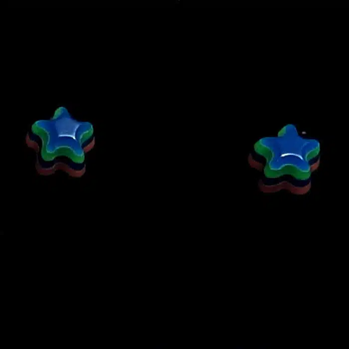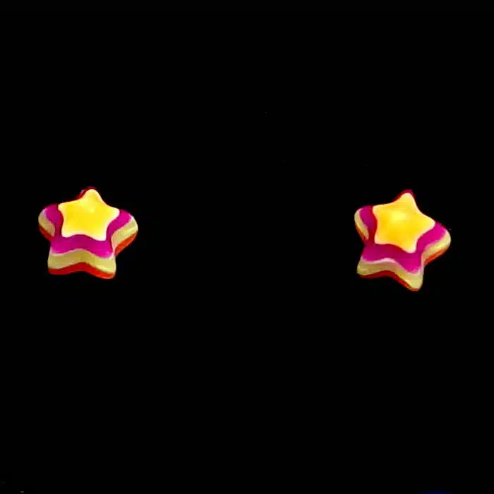 Retro Star Stud Earrings have a sterling silver post and butterflies. So they will not irritate your ears as this is a good quality. They feature gorgeous multi coloured layered stars. With so many retro vibrant colours, it will be difficult to choose just one pair. They are also non offensive and a bit of fun. The star is made from epoxy resin.