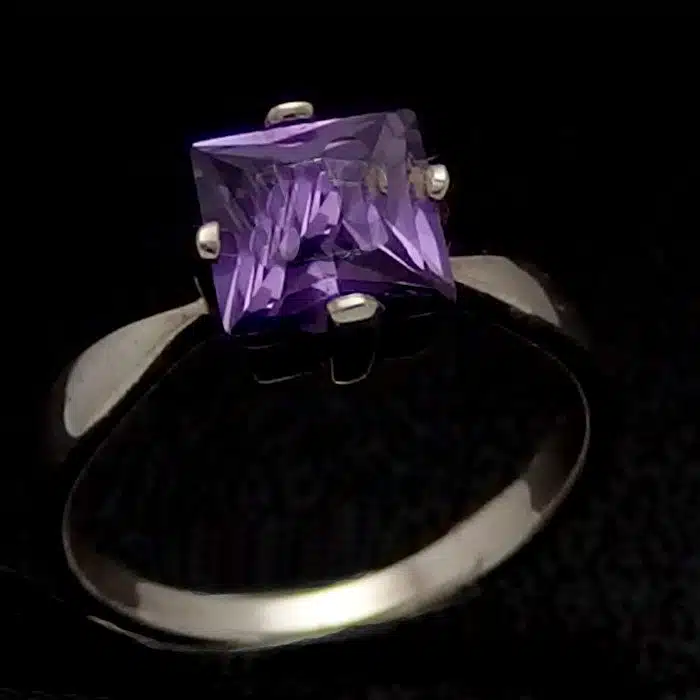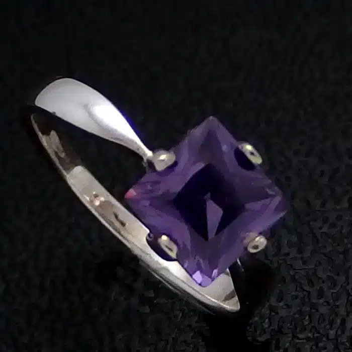 Amethyst Cubic Zirconia Princess Cut Silver Ring is sterling silver 92.5. It features a solitaire square cut cubic zirconia in a gorgeous purple amethyst colour. This classic simple style is so very sweet. The jewel has been nicely cut with many facets.