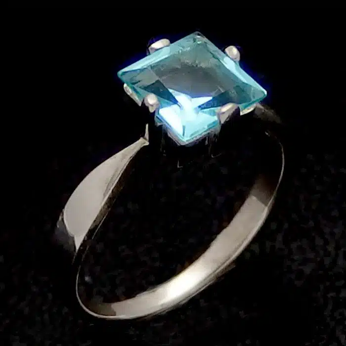 Aqua Princess Cut Silver Ring is made from sterling silver and features a 92.5 stamp. This means it is 92.5% fine silver with no more than 7.5% of copper or other metals. This formula is internationally accepted and it gives sterling silver the hardness and the tolerance to work with. Anything higher than 92.5 would be too soft and tarnish too quickly. When you buy sterling silver from us, we can guarantee it is just that!