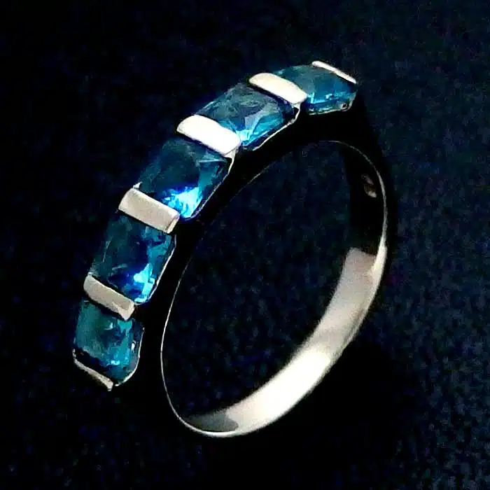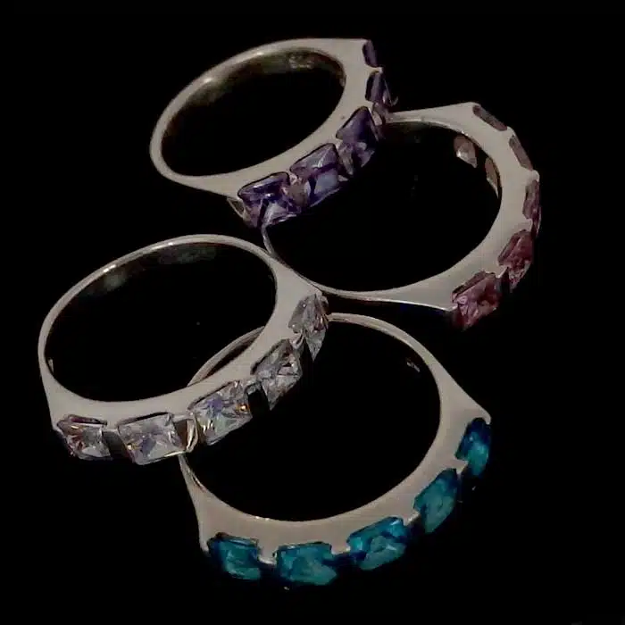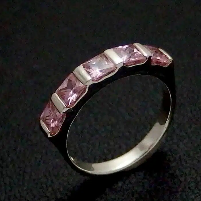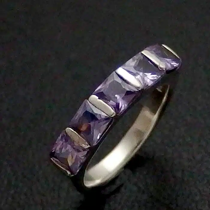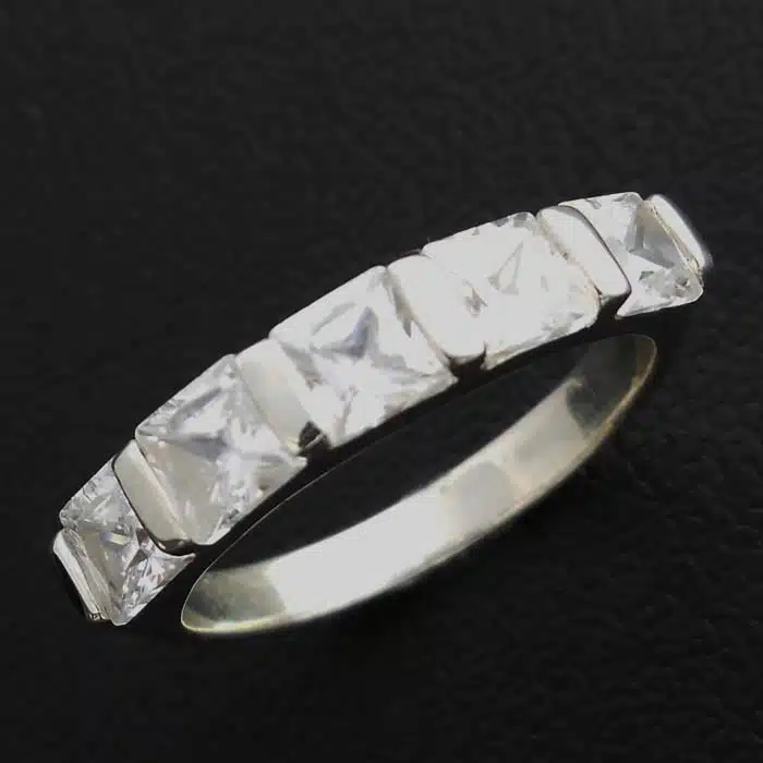 Bar Setting Princess CZ Silver Rings are in sterling silver 92.5. The cz stones or cubic zirconia are in a square princess cut and in many different colours. Bar setting which means the cubic zirconia are sitting in between silver bars.