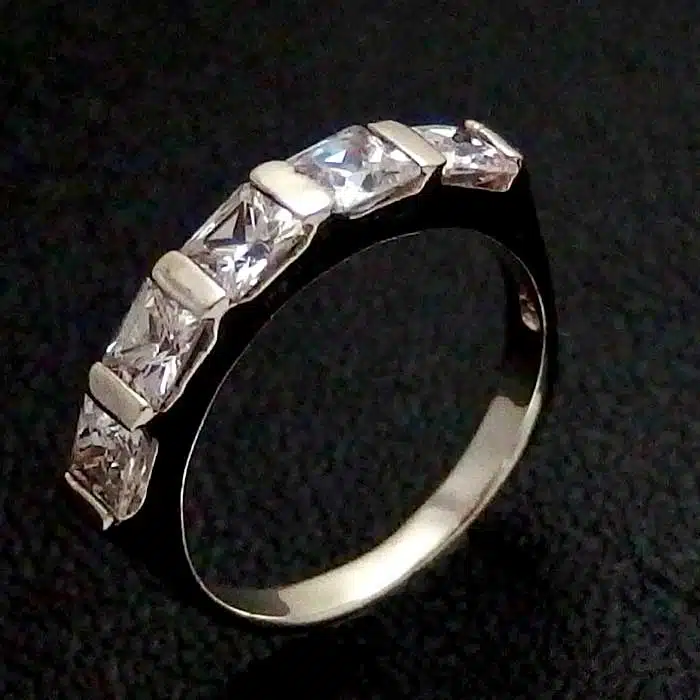 Because these Bar Setting Princess Cz Silver Rings are made from sterling silver they  features a 92.5 stamp. This means it is 92.5% fine silver with no more than 7.5% of copper or other metals. This formula is internationally accepted and it gives sterling silver the hardness and the tolerance to work with. Anything higher than 92.5 would be too soft and tarnish too quickly. When you buy sterling silver from us, we can guarantee it is just that!