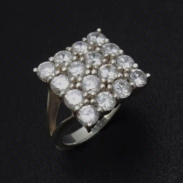 Cluster cz ring in sterling silver 92.5. Stones are cubic zirconia with a round cut. Each stone has a 4mm diameter. Stone cluster of cz measures at 16mm long x 16mm wide. Shank is 1mm thick. The cluster cz ring is made from sterling silver and features a 92.5 stamp. This means it is 92.5% fine silver with no more than 7.5% of copper or other metals. This formula is internationally accepted and it gives sterling silver the hardness and the tolerance to work with. Anything higher than 92.5 would be too soft and tarnish too quickly. When you buy sterling silver from us, we can guarantee it is just that!