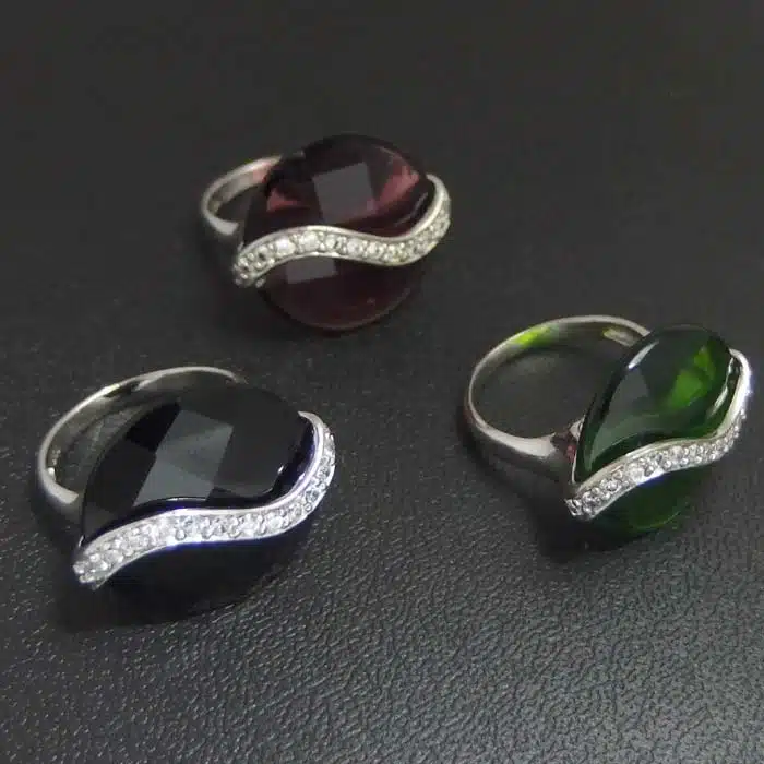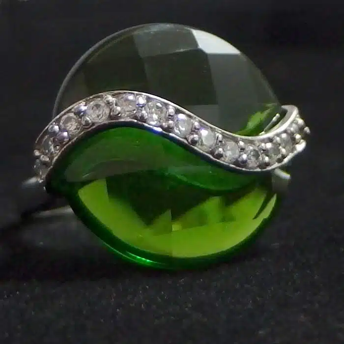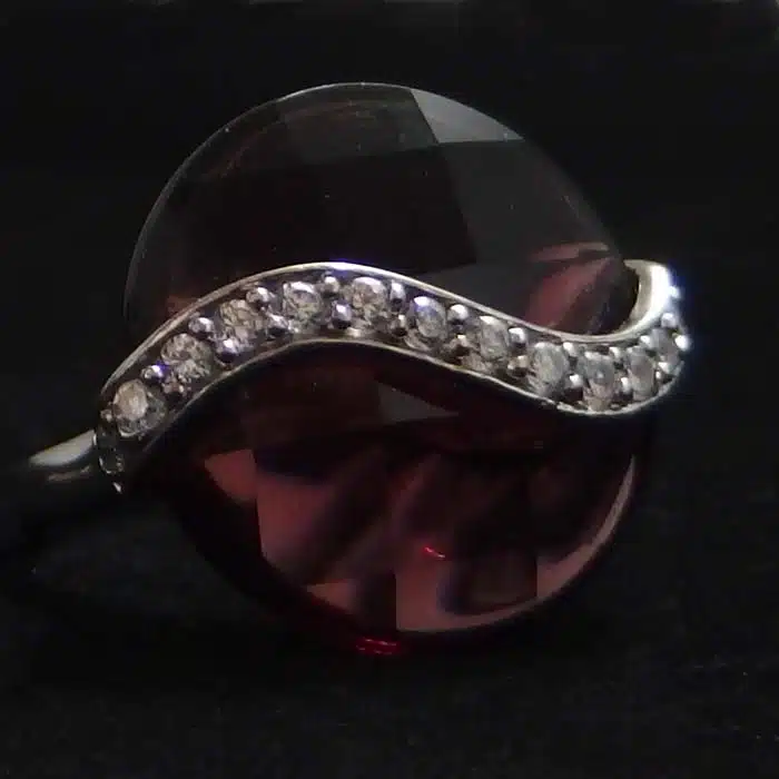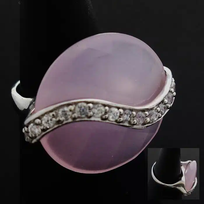 Large Cubic Zirconia Ring is sterling silver 92.5. The large centre stone is 22mm wide and had a swirl of sterling silver through the center. Inside the swirl are many 2mm cubic zirconia. The centre stone is coloured and multi faceted. I am not sure if the stones are real rose quartz, Onyx.. or if they are glass or epoxy resin. But whatever the stones are, they look cool.