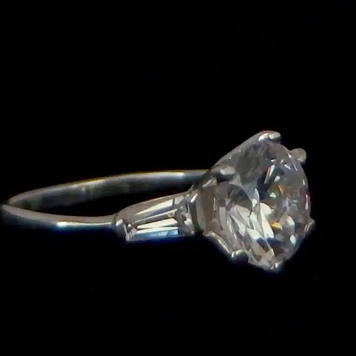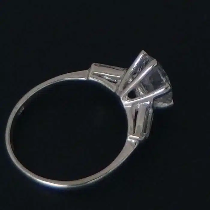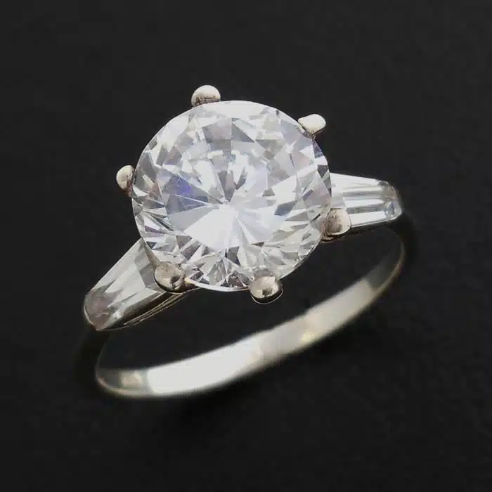 The bling cubic zirconia ring is sterling silver 92.5. It features a large round brilliant cut stone with small triangular stones on each side. Bling centre stone is a massive 9 mm diameter. Whoop, whoop if that was a real diamond it would be worth an absolute fortune. It sure looks like one and who is not to know that it is not set in white gold? Your secret is safe with us!