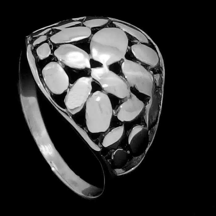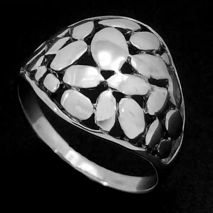 This Intricate Dome Ring Silver is made from sterling silver and features a 92.5 stamp. This means it is 92.5% fine silver with no more than 7.5% of copper or other metals. This formula is internationally accepted and it gives sterling silver the hardness and the tolerance to work with. Anything higher than 92.5 would be too soft and tarnish too quickly. When you buy sterling silver from us, we can guarantee it is just that!