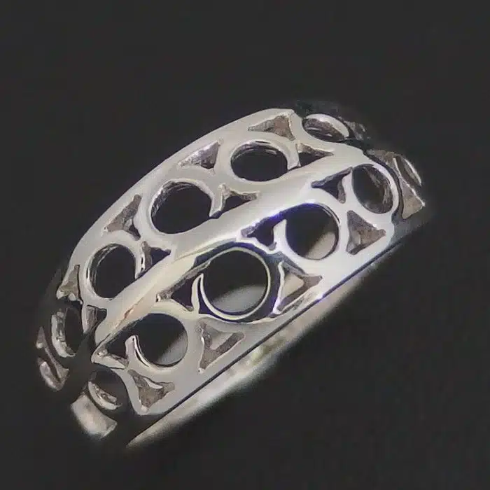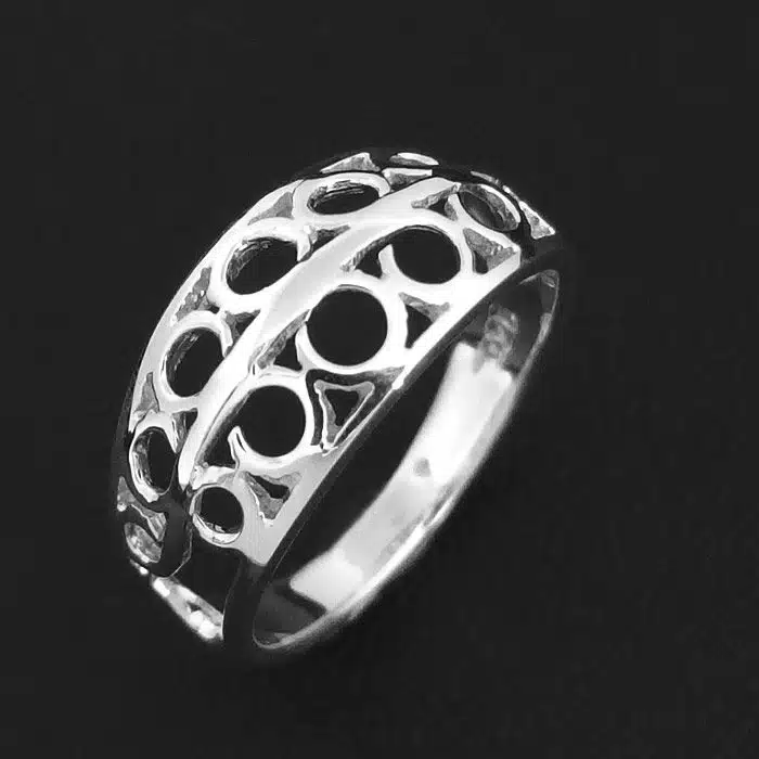 Cut out circles ring is sterling silver 92.5. A tapered band with cut out neatly aligned circles that become smaller as they go around the band. Beautifully cut out detailing in this ring with a good amount of weight making it strong. Shop online with us for your Sterling Silver rings NZ