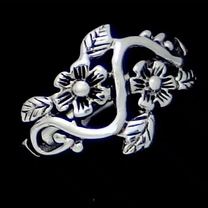 This Filigree floral ring is made from sterling silver and features a 92.5 stamp. This means it is 92.5% fine silver with no more than 7.5% of copper or other metals. This formula is internationally accepted and it gives sterling silver the hardness and the tolerance to work with. Anything higher than 92.5 would be too soft and tarnish too quickly. When you buy sterling silver from us, we can guarantee it is just that!