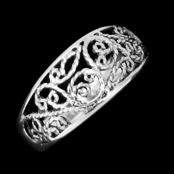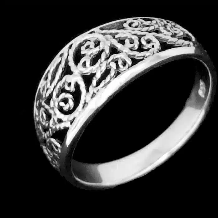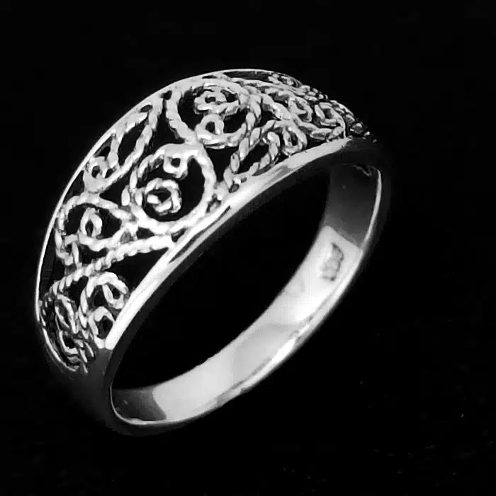 This intricate silver filigree ring is made from sterling silver and features a 92.5 stamp. This means it is 92.5% fine silver with no more than 7.5% of copper or other metals. This formula is internationally accepted and it gives sterling silver the hardness and the tolerance to work with. Anything higher than 92.5 would be too soft and tarnish too quickly. When you buy sterling silver from us, we can guarantee it is just that!