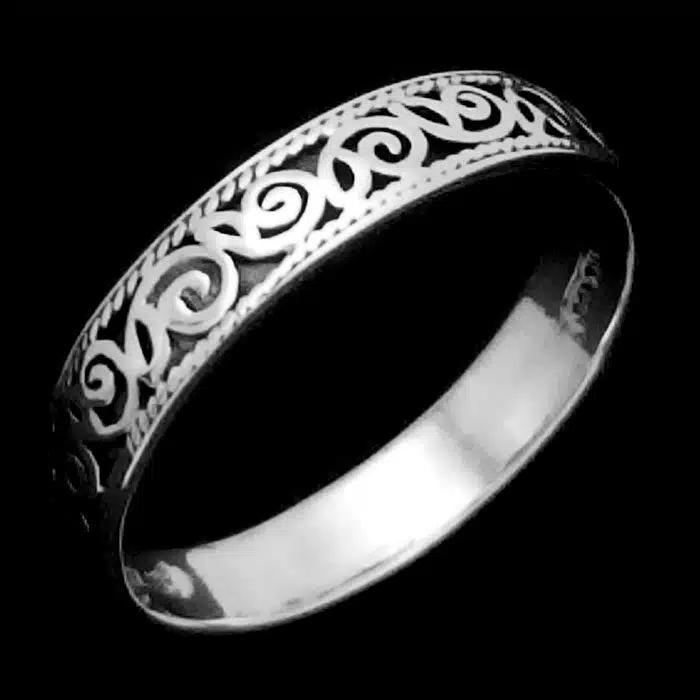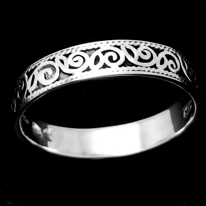 The Silver Filigree Band Ring is made from sterling silver and features a 92.5 stamp. This means it is 92.5% fine silver with no more than 7.5% of copper or other metals. This formula is internationally accepted and it gives sterling silver the hardness and the tolerance to work with. Anything higher than 92.5 would be too soft and tarnish too quickly. When you buy sterling silver from us, we can guarantee it is just that!