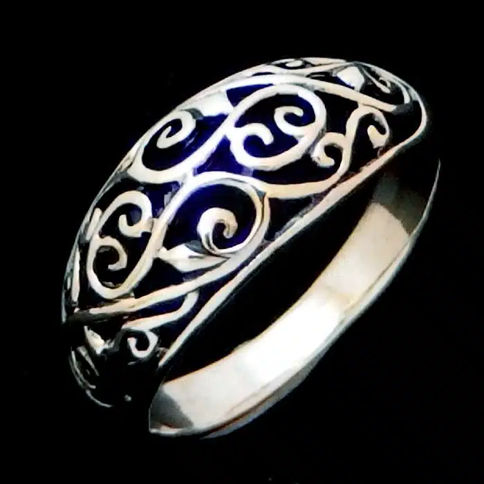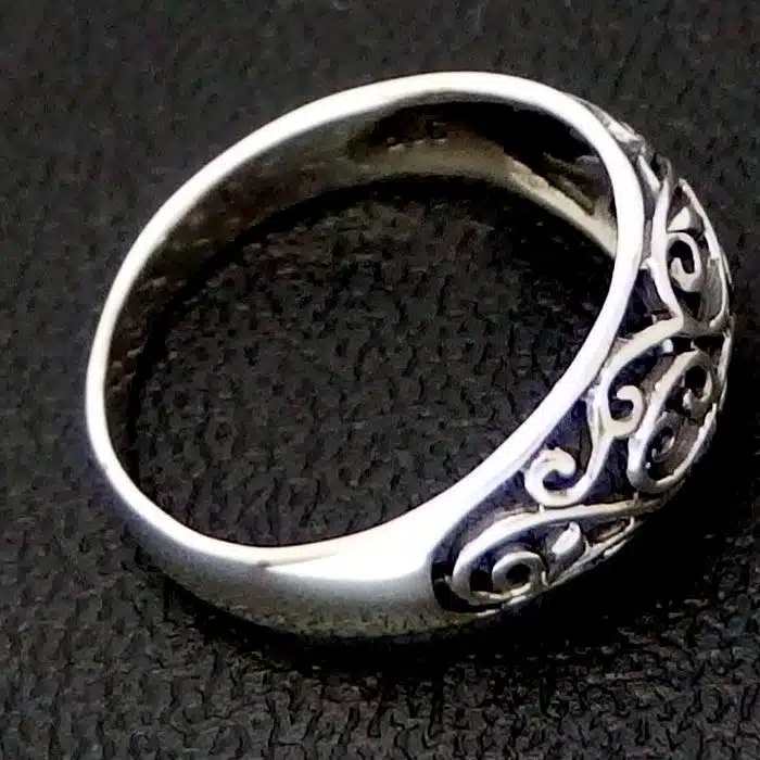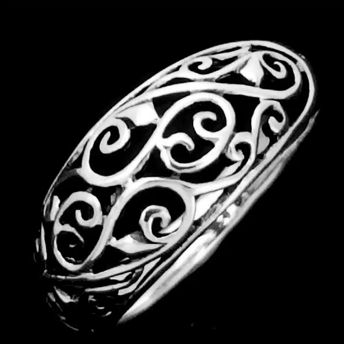 Silver Filigree Ring NZ had intricately cut out spirals and korus inspired by New Zealand nature and iconic of Maori art and tattoos. This ring is slighlt raised in a dome shape giving the appearance of a more expensive and thicker ring and adding to the appeal of this silver filigree ring