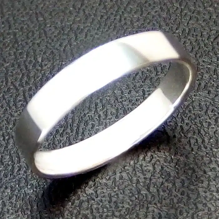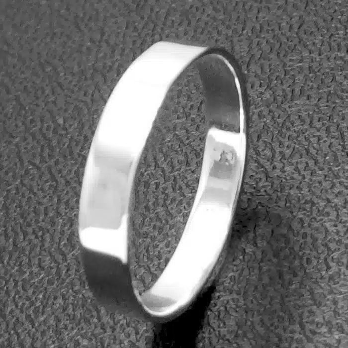 Flat 4mm band ring is sterling silver 92.5 is a smooth 4 mm plain band ring with flat squared edges. Great for guys -we go up to large sizes to cater for you men too -see the linked product below for big sizes. Has a nice 1-1.5 mm thick shank. Nice strong ring!